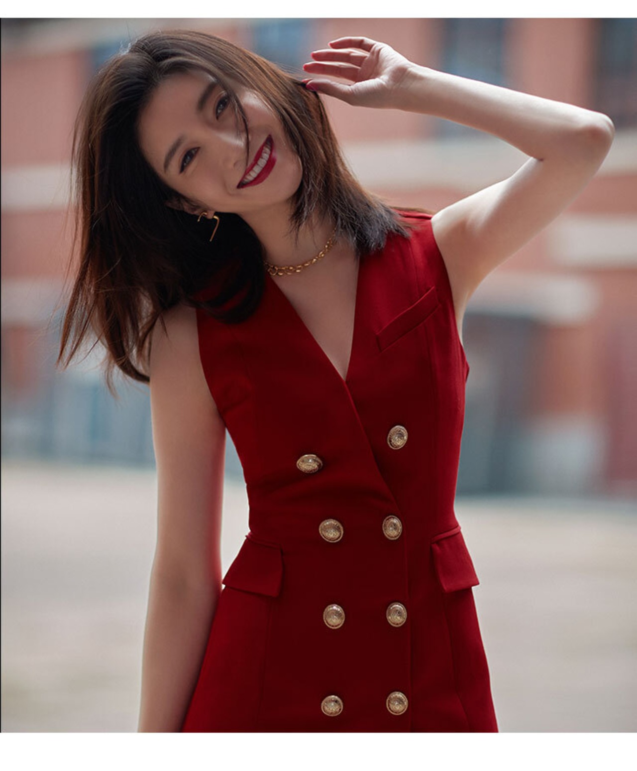 新品 韓流スター レッドVネックスカート ダブルブレストゴールドバックル ⦿韓国 オルチャン K-pop アイドル ジャケット スーツ ワンピース カーディガン ニット フーディー トレーナー キャミソール スカート シャツ ブラウス 6A1103955 | K Star Clothing